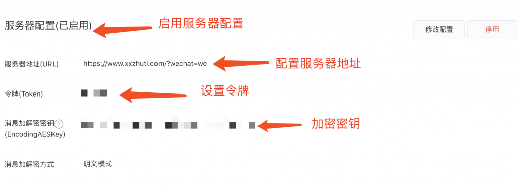 进入公众号 “开发->基本配置” 中,设置下面的选项